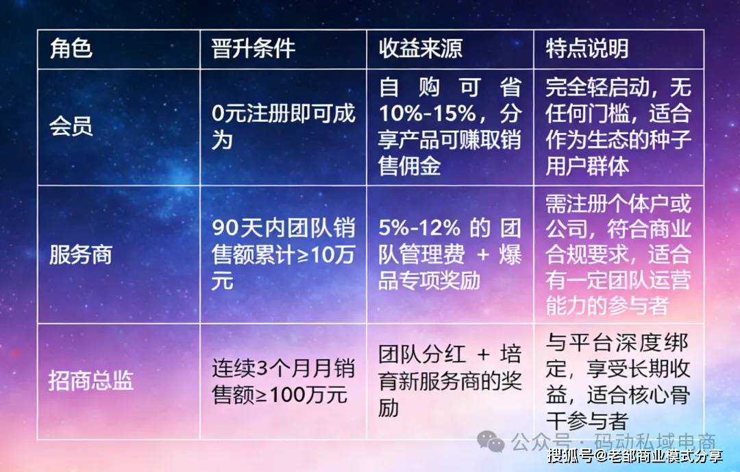 以平台(S端)为焦点,为小b端(会员/办事商)供给全链赋能,最终配合办事C端消费者。而让这套模式快速起量的环节,正在于其极具吸引力的“三无轻创业机制”,完全降低了小b端的参取门槛,同时规避了行业常见的合规风险。1、零成本启动,不烧/钱:采用0元注册会员机制,仅需缴纳365元可退金即可分享创业,极大提拔了通俗人的参取志愿;2、零库存压力,不囤货:平台包办全链后端工做,从供应链整合、仓储物流到售后均由S端同一担任,小b端只需专注前端的用户分享取沟通,无需承担任何库存风险;3、零层级分销,不分销:严酷多级拉人头模式,小b端的收益仅来历于两部门——10%-15%的发卖佣金,以及5%-12%的团队办理费,收益取发卖实绩间接挂钩,从架构上规避了类传销风险,保障模式合规性。